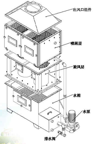 氣旋混動(dòng)噴淋?chē)娏芩?,是處理有害廢氣的主要設(shè)備。工作時(shí),有害廢氣由塔底切向進(jìn)塔,在塔板葉片的導(dǎo)向作用下使煙氣旋轉(zhuǎn)上升,并在塔板上將隨板下流的液體噴成霧滴,增大氣液間的接觸面積;液滴被氣流帶動(dòng)旋轉(zhuǎn),產(chǎn)生